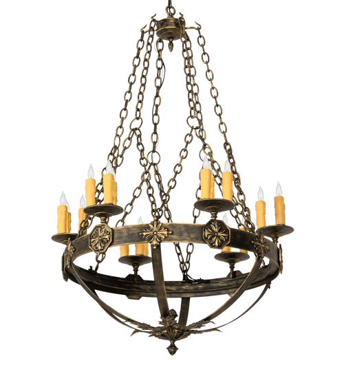This stunning chandelier features a sturdy ring with medallions in a Textured Black with Gold Highlights finish. 18 Ivory faux candlelights illuminate while embraced by bobeches attached to this sturdy ring. The overall height ranges from 55 to 174 inches as the chain length can be easily adjusted in the field to accommodate your specific lighting application needs. Highly skilled artisans utilize multiple hand forging techniques to apply a variety of handsome metal textures for a unique look. Custom crafted in our 180,000 square foot manufacturing facility in Yorkville, NY. Special sizes, styles and colors are available. UL and cUL listed for dry and damp locations.