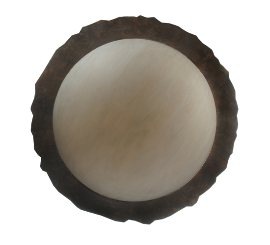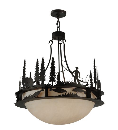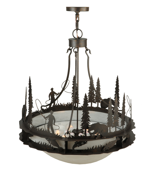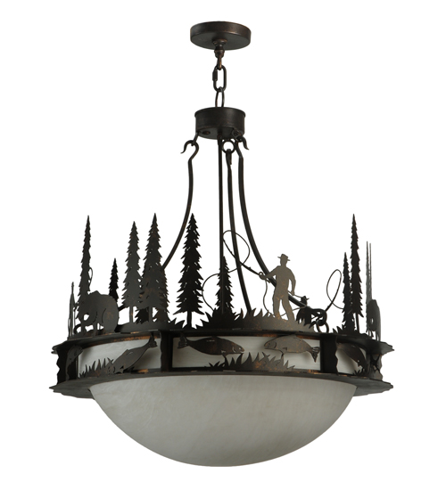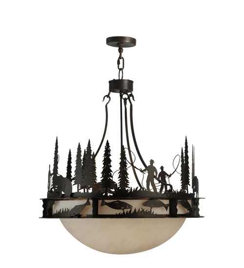 A sportsman hooks a prized fish in a mountain stream while the morning sun rises in the background. Radiant ambient light is diffused beautifully through a Fleshtone Idalight diffuser, which is enhanced with Copper Rust finished accents and frame, including hooks attaching the shade to the central hub. The fixture is handcrafted in the manufacturing facility at the foothills of the Adirondack Mountain Lake Region in the USA. Custom styles, designs and sizes are offered. Energy efficient lamping options are available as well. The 32-inch wide pendant is UL and cUL listed for dry and damp locations.