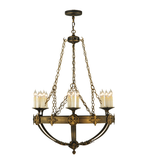 A ring with medallions in a Textured Black with Rich Gold Highlights finish serves as the centerpiece of this stunning chandelier. 18 Ivory faux candlelights illuminate while embraced by bobeches attached to the sturdy ring. The frame and hardware are featured in a matching finish. The overall height ranges from 55 to 125 inches as the chain length can be easily adjusted in the field to accommodate your specific lighting application needs. Highly skilled artisans utilize multiple old world hand forging techniques to apply a variety of handsome metal textures for a unique look. Custom crafted in our 180,000 square foot manufacturing facility in Yorkville, NY. Special sizes, styles and colors are available. UL and cUL listed for dry and damp locations.