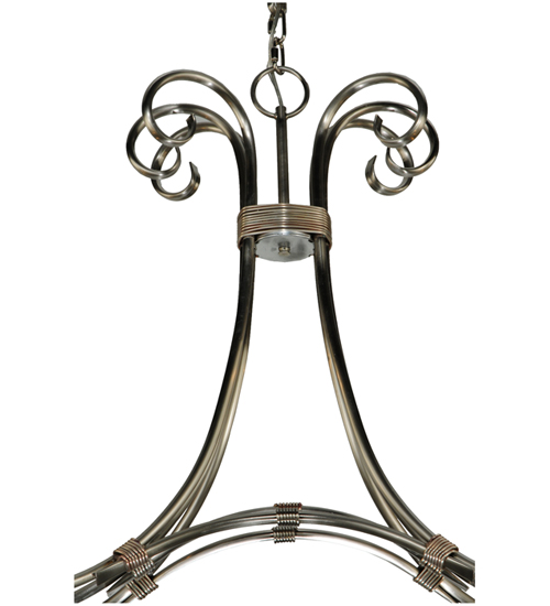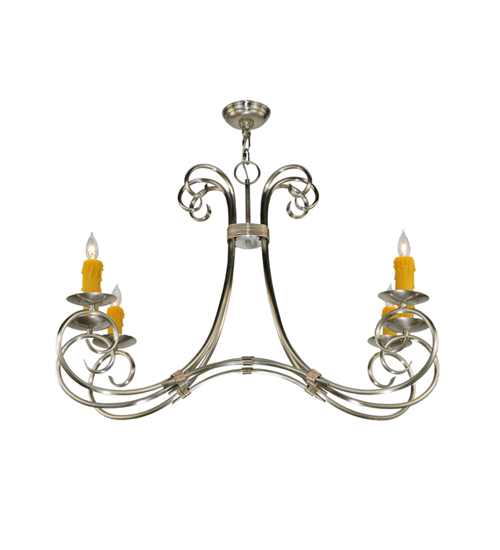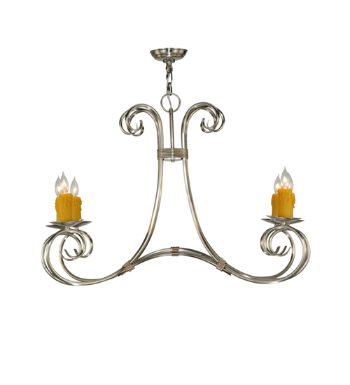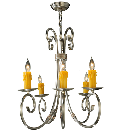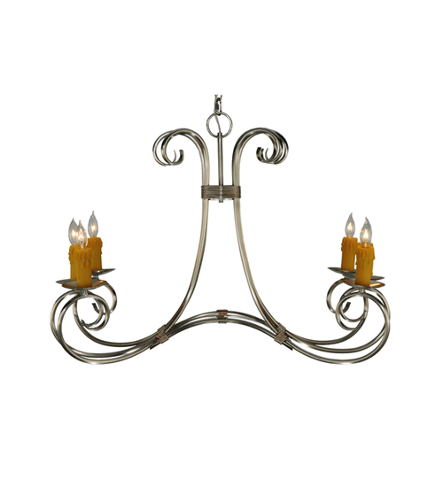 Graceful scroll like waves of metal with matching accents above creates elegant charm and visual interest. The 6 Hand Forged Iron scrolled arms embrace round bobeches with Amber faux candlelights that deliver a soft glow. The hardware and frame are featured in a Brushed Nickel finish. Handcrafted in our 180,000 manufacturing facility in Yorkville, New York. The overall height of this pendant ranges from 30 to 77 inches as the chain length can be easily adjusted in the field to accommodate your specific lighting application needs. Available in custom sizes and finishes. UL and cUL listed for damp and dry locations.