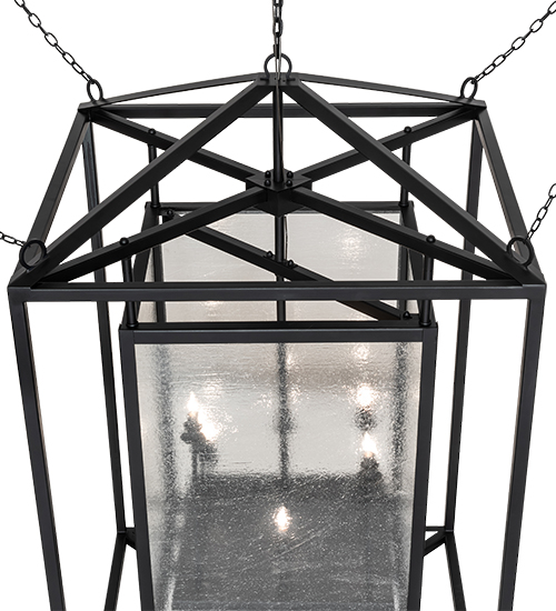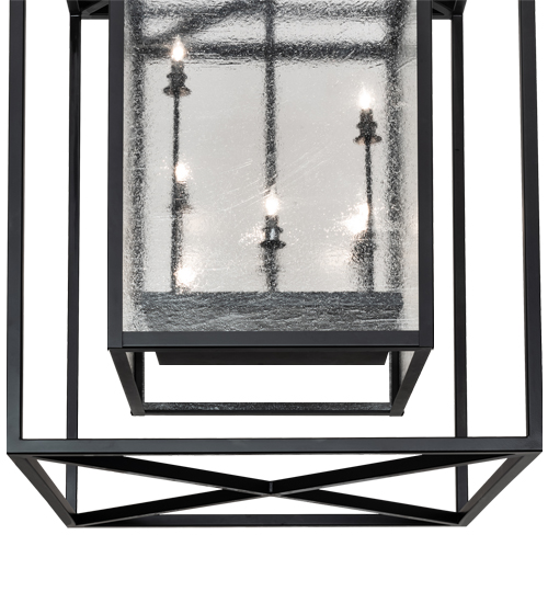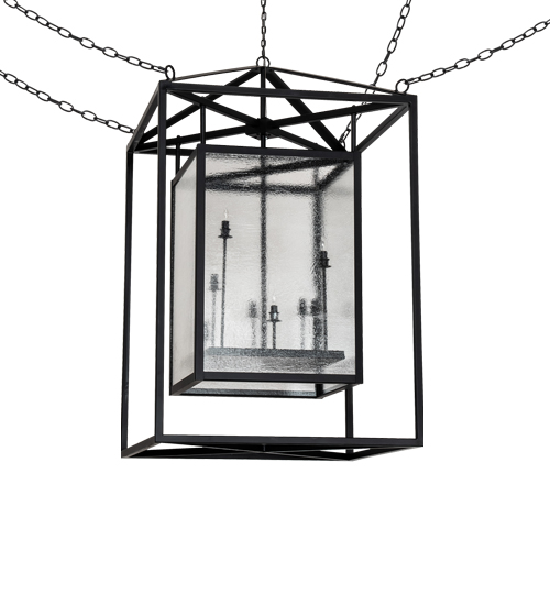 This architecturally styled fixture is designed with a pizazz that is unique and stylish. The elaborate geometric structure features Clear Seeded Glass that reveals complementary lamps designed at different heights inside this cube-within-a-cube design. The fixture is enhanced with a Flat Black Finish. Overall height ranges from 62 to 178 inches as the chains easily adjust in the field. The anti-sway chains ensure that the pendant remains upright in a fixed position regardless of structural vibration or wind. The Kitzi Box Pendant is featured in our American made, American designed, handcrafted Transitional Lighting Collection. Manufactured in Yorkville, New York. UL and cUL listed for dry and damp locations.