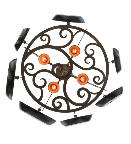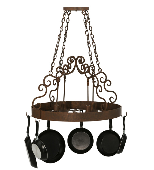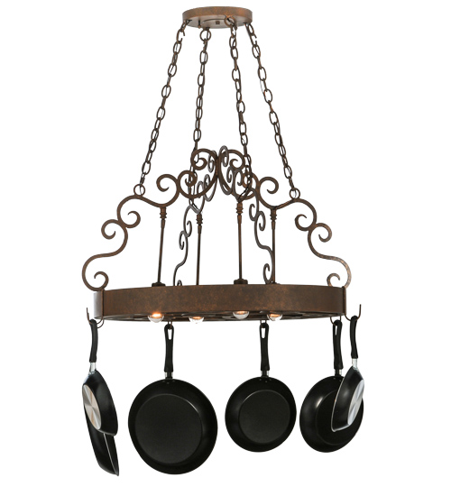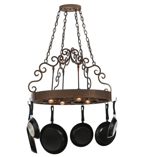 This exquisite yet sturdy Dior Lighted Pot Rack features a stunning scrolled design with matching accents above. Hooks are available to display your fine cookware on this fixture which is handcrafted in the USA by highly skilled artisans. The frame, accents and hardware are featured in an Antique Rust finish. 4 Customer-supplied Medium based Downlights provide functional illumination on surfaces. Custom options include special sizes, finishes and designs, as well as dimmable energy efficient lamps, to transform the rack into a lighting fixture. The 32-inch wide pendant is UL and cUL listed for dry and damp locations. (Cookware not included)