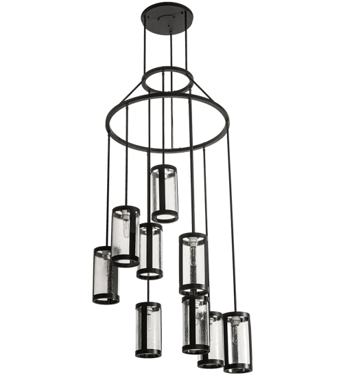 Spanning up to more than 7 feet from top to bottom, this two-tiered chandelier renders an eye-catching transitional look. Stunning Clear Seeded Glass shades are aligned in a staggered formation, suspended from two decorative rings and a canopy while providing beautiful light at various levels. All hardware is hand-finished in Solar Black while an inviting glow evokes from 9 decorative cylinders. Ideal for illuminating entryways, lobbies, foyers, ballrooms, and other residential, hospitality, and commercial spaces. The Cartier Cascading Chandelier is included in our American-made, American-designed, handcrafted Transitional Lighting Collection. Manufactured in Yorkville, NY. UL and cUL listed for dry and damp locations.