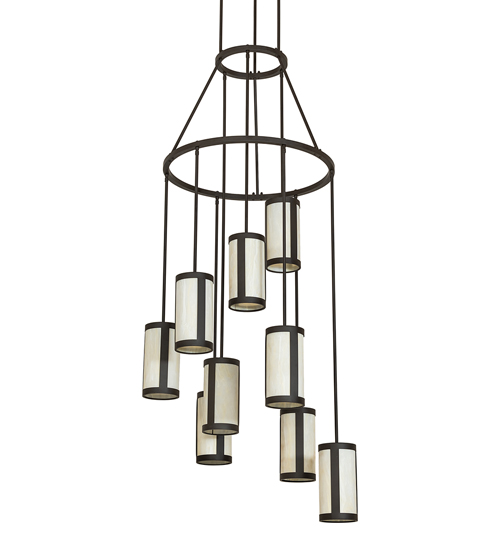 Spanning up to more than 10 feet from top to bottom, a two-tiered chandelier renders an eye-catching transitional look. Handsome Creme Carrare Idalight shades are aligned in a staggered formation, suspended from two decorative rings and a canopy while providing light at various levels. All hardware is hand-finished in Oil Rubbed Bronze while a warm glow evokes from nine decorative cylinders. Ideal for illuminating entryways, lobbies, foyers, ballrooms, and other residential, hospitality, and commercial spaces. The Cartier Cascading Chandelier is featured in our American-made, American-designed, handcrafted Transitional Lighting Collection. Manufactured in Yorkville, NY. UL and cUL listed for dry and damp locations.