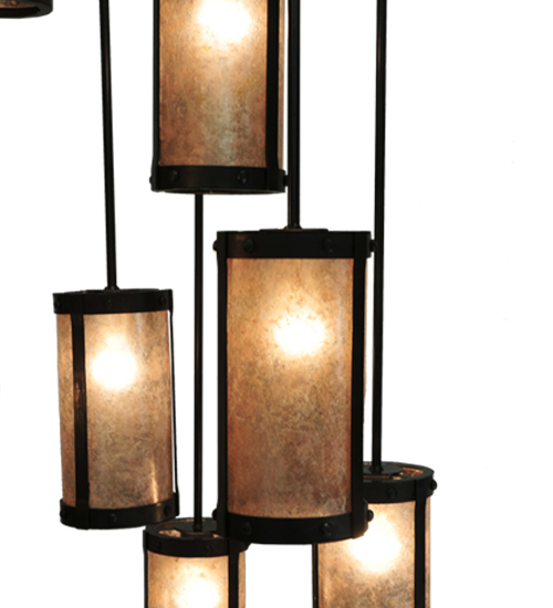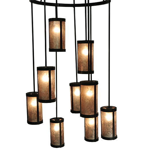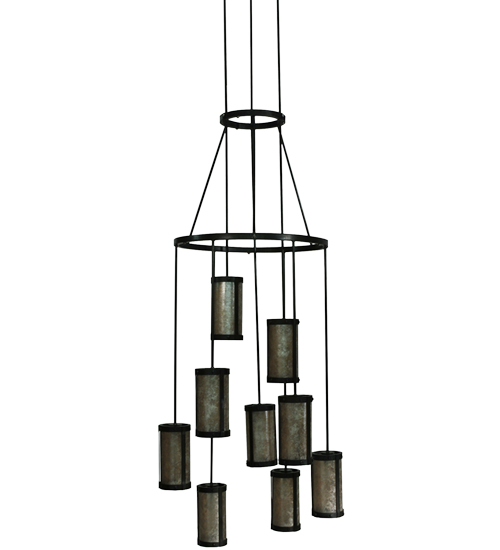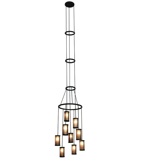 Spanning 16 feet from top to bottom, this two tiered chandelier renders a transitional eye-catching look. Handsome Silver Mica shades are aligned in a staggered formation, suspended from two decorative rings and a canopy while providing light at various levels. All hardware is hand finished in Costello Black while a warm glow evokes from nine decorative cylinders, ideal for lobbies, foyers, ballrooms and large spaces. Custom crafted in our Upstate New York manufacturing facilities.