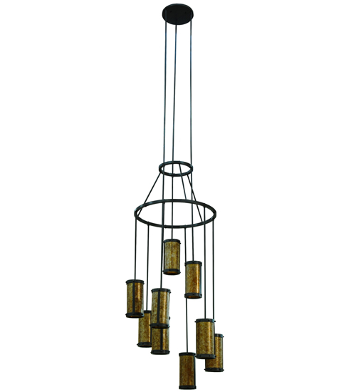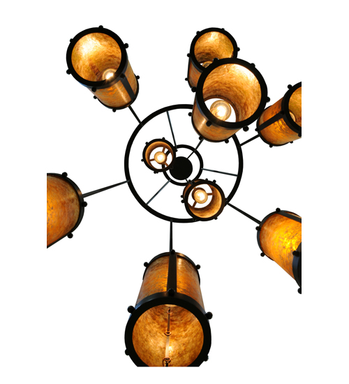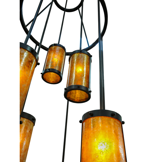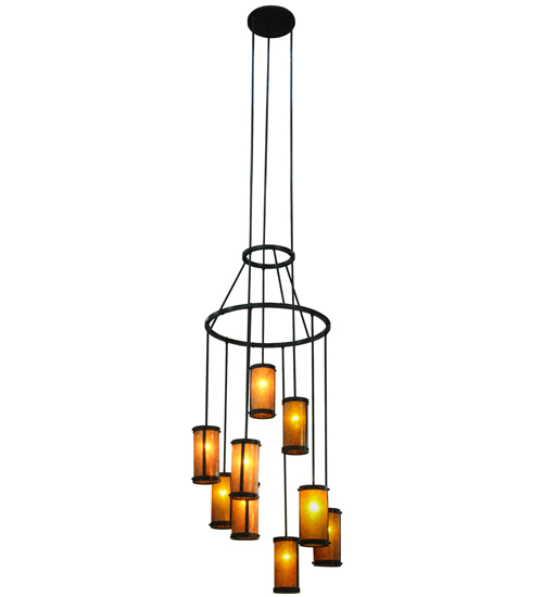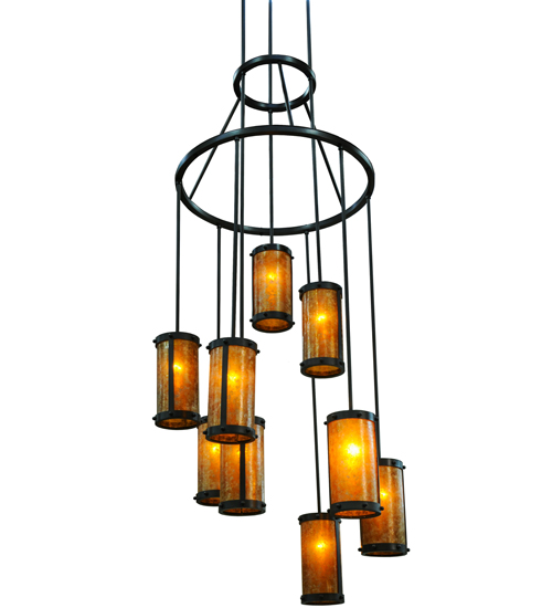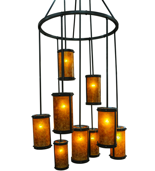 An innovative, stunning transitional look. Nine cylindrical Amber Mica shades suspended from this two tier chandelier. Three shades suspended at staggered heights from three rods attached to the canopy, with six shades hanging at different lengths from the lower of two tiers. The upper tier embraces the lower tier with angular supports. All rings, rods and hardware hand finished in a bold Costello Black. Ideal for high ceiling spaces including foyers and entryways, lobbies, houses of worship, ballrooms, and more. Handcrafted by artisans in our manufacturing facilities in the USA. Custom colors, styles and sizes available. Energy efficient lamping options.