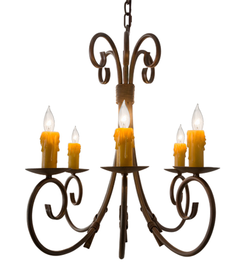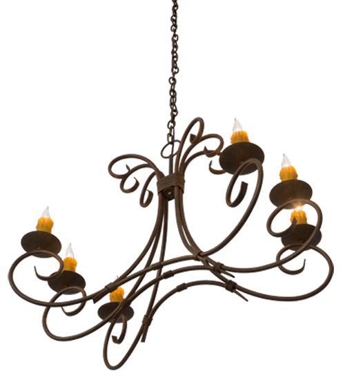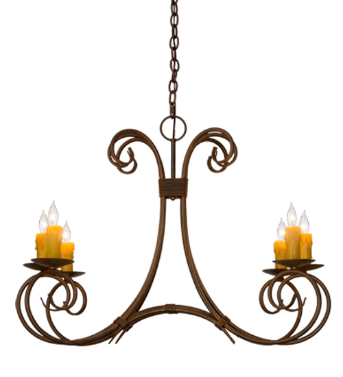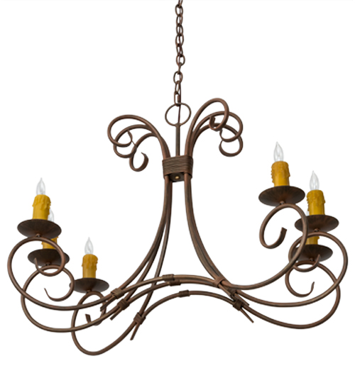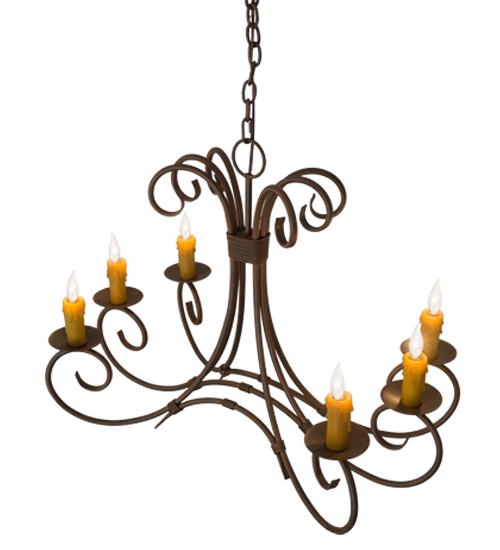 Graceful scroll like waves of metal with matching accents above creates elegant charm and visual interest. The 6 Hand-Forged Iron scrolled arms embrace round bobeches with Amber faux candlelights that deliver a soft glow. The hardware and frame are featured in a Cortez Gold finish. Handcrafted in our 180,000 manufacturing facility in Yorkville, New York. The overall height of this pendant ranges from 30 to 77 inches as the chain length can be easily adjusted in the field to accommodate your specific lighting application needs. Available in custom sizes and finishes. UL and cUL listed for damp and dry locations.