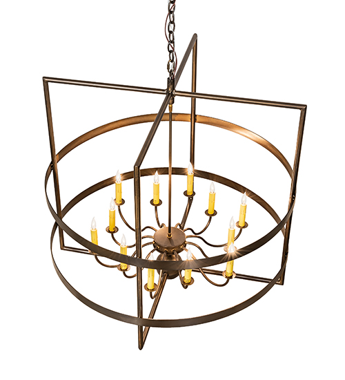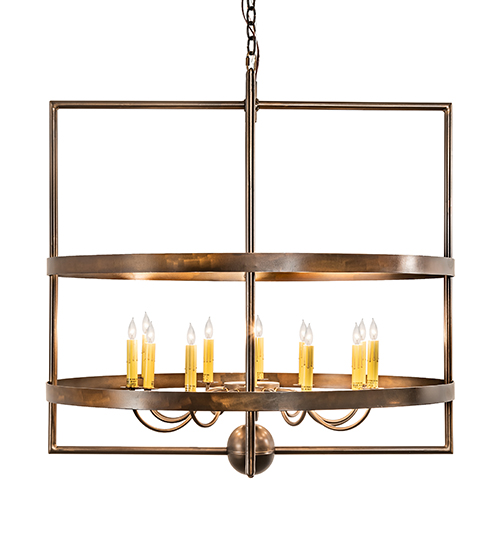 Combining a Grand classic look with industrial styling. The Aldari chandelier features 12 faux candlelights which provide beautiful ambient lighting from within. A sturdy geometric frame is encircled by two rugged decorative rings for a unique look. The fixture is enhanced with an Antique Copper finish. The overall height of this chandelier ranges from 43 to 67 inches as the chain length can be easily adjusted in the field to accommodate your specific lighting application needs. Number of lights, metal finishes and fixture sizes can be customized. Custom crafted by highly skilled artisans in our 180,000 square foot manufacturing facility in Yorkville, New York. UL and cUL listed for dry and damp locations.