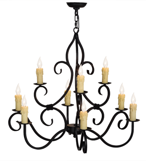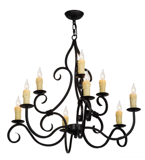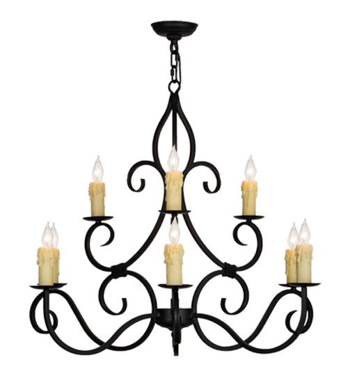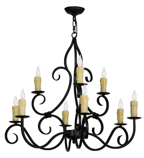 Gracefully and elegantly designed as a centerpiece for nearly any space. The distinctive Clayton chandelier features luxurious Hand-Forged Iron scrollwork in a Blackwash finish. Perched on bobeches are 9 delicate Ivory faux candlelights which provide beautiful ambient illumination. The overall height ranges from 33 to 80 inches as the chain length can be easily adjusted in the field to accommodate your specific lighting application needs. Handcrafted by master artisans in our 180,000 square foot manufacturing facility in Yorkville, New York. Fixture designs, metal finishes and sizes can be customized to meet your needs. UL and cUL listed for damp and dry locations.
