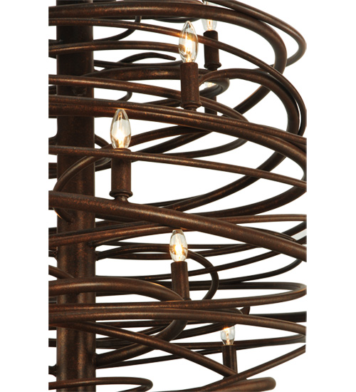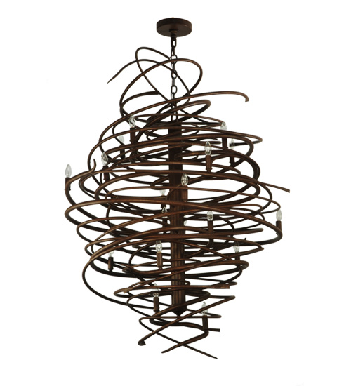 The bold, eye-catching Cyclone simulates whirling winds of energy and gyration with twisting steel that is accentuated with 18 delicately placed beacons to help you weather the storm. The winding mass of steel surrounds a sturdy post, all featured in our Antique Rust finish. Make an impressive design statement that will wow guests in lobbies, conference rooms, entryways and other residential and commercial spaces. The fixture is handcrafted by master artisans in our Upstate New York manufacturing facility. Custom designs, styles, sizes and dimmable energy efficient lamping such as LEDs are available. This chandelier is UL and cUL listed for damp and dry locations.