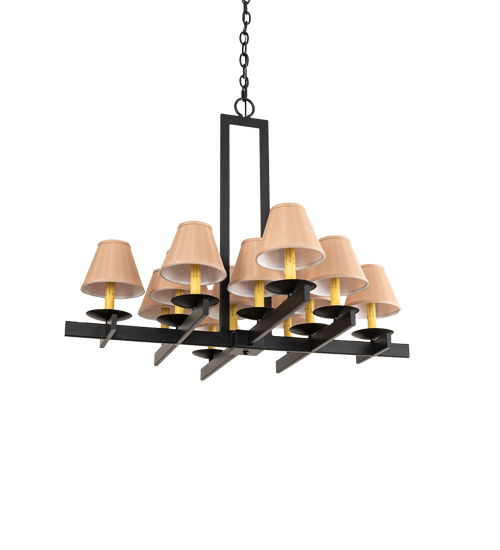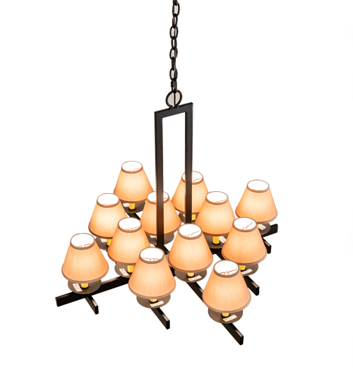 Expert craftsmanship and a distinctive elegance come to light with a luxurious chandelier that entices all to see.12 Amber faux candlelights are crowned with Faille Taupe Shades. The shades are complemented with a sturdy crossbar frame and hardware in a Blackwash finish. The overall height of this pendant ranges from 32 to 68 inches and the chain length can be easily adjusted in the field to accommodate your specific lighting application needs. The fixture is custom crafted in our 180,000 square foot manufacturing facility in Yorkville, NY. Custom styles, designs, and shade colors are available. UL and cUL listed for dry and damp locations.