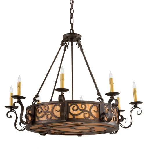 A touch of warm opulence is blended with elegant scroll-like styling. This chandelier offers a lovely transitional style, which is handcrafted with a stunning Ambra Siena Idalight diffuser enhanced with decorative accents and hardware featured in a stunning Copper Rust finish. The fixture integrates sparkling illumination emanating from eight Ivory faux candlelights perched on bobeches embraced by scroll styled arms. Custom crafted in the USA, this fixture is available in custom sizes, styles, colors and dimmable energy efficient lamping. Delano is UL and cUL listed for damp and dry locations.
