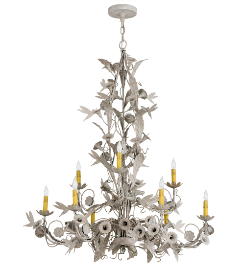 The natural beauty and vibrant pulse of earthly gardens awaken with elaborate accents depicting stunning floral leaves and branches born in the woodlands. Like the soul of the forest itself, this chandelier is an undeniable source of beauty and light. 9 Plant-like adorned arms embrace Ivory colored faux candlelights that sprout shimmering rays of illumination while graceful songbirds and dragonflies fly among the flowers. Solid steel frame and decorative accents are hand finished in Tuscan Ivory. Handcrafted by artisans in our 180,000 square foot manufacturing facility in Yorkville, New York. Ask about custom sizes, styles, colors and dimmable energy efficient lamping options. UL and cUL listed for dry and damp locations.