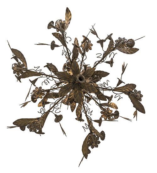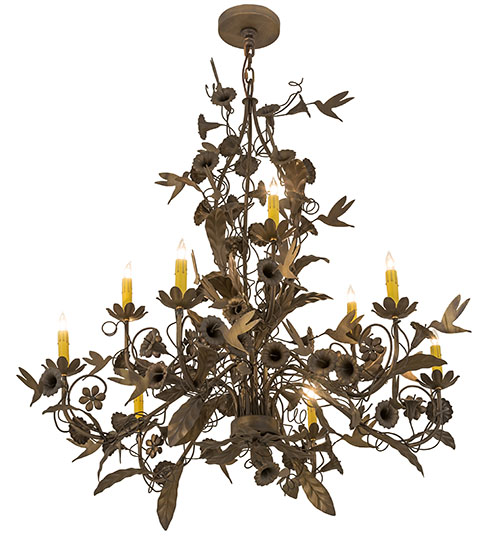 The natural beauty and vibrant pulse of earthly gardens awaken with elaborate accents depicting stunning floral leaves and branches born in the woodlands. Like the soul of the forest itself, this chandelier is an undeniable source of beauty and light. Nine Plant-like adorned arms embrace Ivory colored faux candle lights. Petal flower designed bobeches appear to sprout from the center while graceful Hummingbirds fly among the Morning Glory flowers. Solid metal frame and decorative accents are featured in an Antique Brass Matte finish. Handcrafted in 180,000 square manufacturing facility in Yorkville, NY. Available in custom sizes, styles, finishes and dimmable energy efficient lamping options. UL and cUL listed for dry and damp locations.
