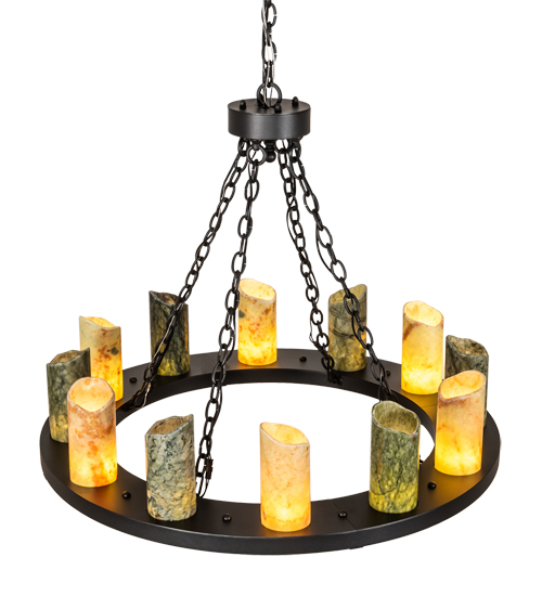 Blending an elegant style with a classic distinguished look. Loxley is custom crafted with 12 Light Green and Dark Green Jadestone Cylindres. The chandelier is featured in an Old Wrought Iron finish. Ideal for lighting applications in dining areas, conference tables, lobbies and other residential, hospitality and commercial spaces. The overall height ranges from 33 to 63 inches as the chain length can be easily adjusted in the field to accommodate your specific lighting needs. Handcrafted by highly skilled artisans in our 180,000 square foot manufacturing facility in Yorkville, New York. Diffuser colors, metal finishes and fixture sizes can be customized to your needs. UL and cUL listed for dry and damp locations.