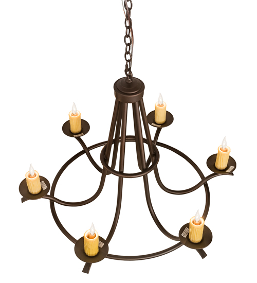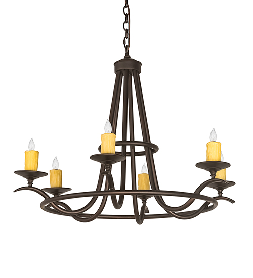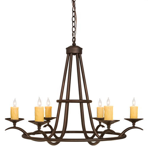 Add graceful details to any interior decor with this elegant lighting design. 6 Ivory faux candlelights are perched on decorative bobeches and provide soft ambient illumination. The elegant frame and hardware is featured in a Mahogany Bronze finish. The overall height ranges from 32 to 68 inches as the chain length can be easily adjusted in the field to accommodate your specific lighting application needs. Handcrafted in our 180,000 square foot manufacturing facility in Yorkville, New York. Custom options include special sizes, diffuser colors and finishes. UL and cUL listed for damp and dry locations.