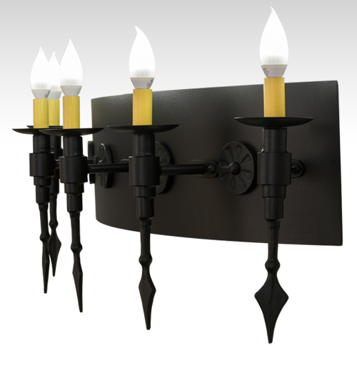 Welcome a handsome Gothic look into your home or business with the stunning Warwick wall sconce, which integrates a distinctive motif with classic styling. Five Ivory faux candlelights, perched atop bobeches embraced on a curved backplate, provide beautiful ambient lighting. Decorated with cast iron medallions and spear tip accents in a Textured Black finish and complemented with a Costello Black, Warwick completes an evocative impression. This fixture is perfect as a vanity light for fine baths or as a wall sconce in hallways and other spaces. Handcrafted in our 180,000 square foot manufacturing facility in Yorkville, New York. Available in custom finishes, sizes and colors, as well as dimmable energy efficient lamping options. UL and cUL listed for damp and dry locations.
