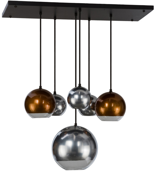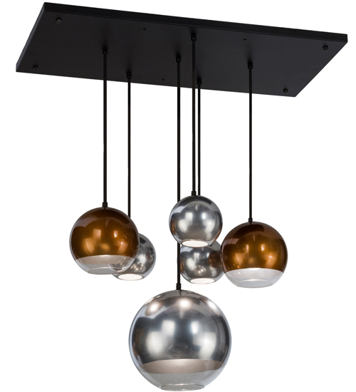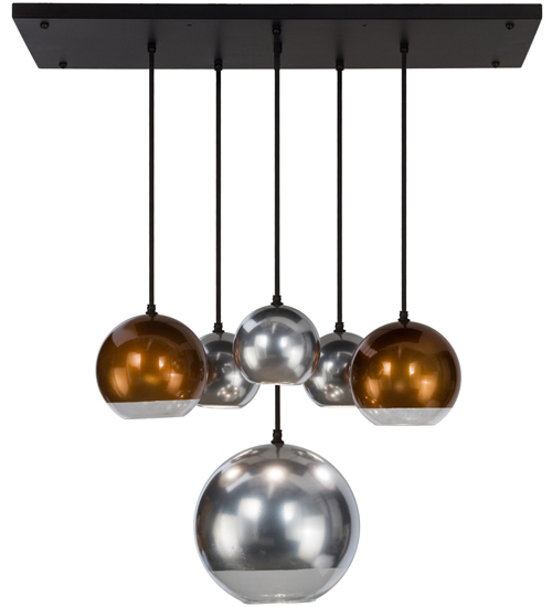 Curved ball shaped pendants featuring mouth blown glass coated with metallic finishes in striking Extreme Chrome and Copper. Handsome hardware finished in Solar Black with cloth covered wire suspending the pendants for a distinctive look. Handcrafted by highly skilled artisans in our 180,000 square foot manufacturing facility in Yorkville, New York. Lens colors, metal finishes and sizes can be customized to meet your needs. UL and cUL listed for damp and dry locations.