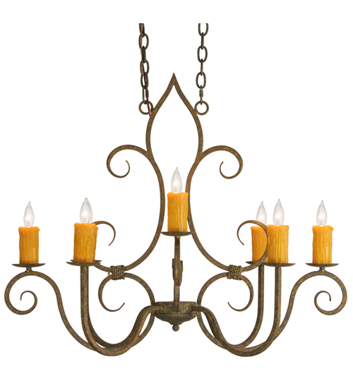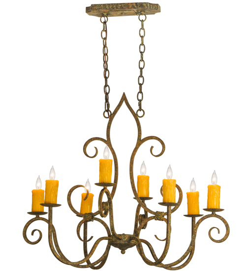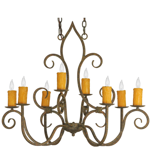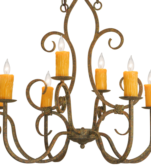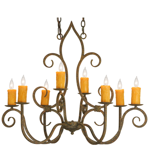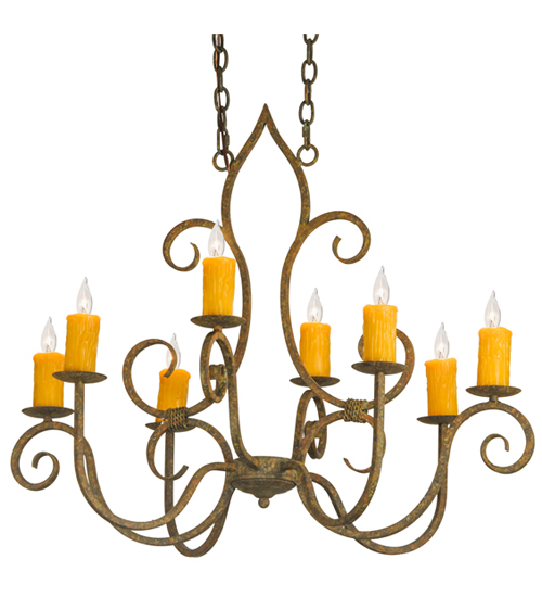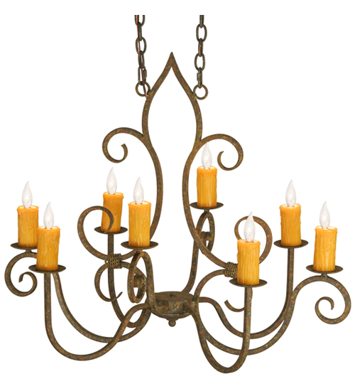 Clifton offers a rich, modern twist on a classic, elegant lighting design. This opulent, sumptuous chandelier features an Organic Rust finish on a solid steel frame with 8 Amber faux candlelights perched on bobeches and enhanced with scroll arms and accents in a matching finish. Handcrafted in the USA, this fixture is available in custom designs, finishes and sizes, as well as energy efficient lamping options such as LED. The chandelier is UL and cUL listed for damp and dry locations.