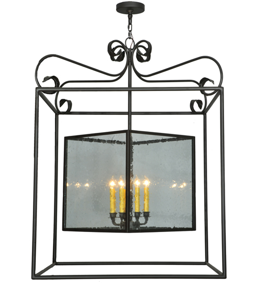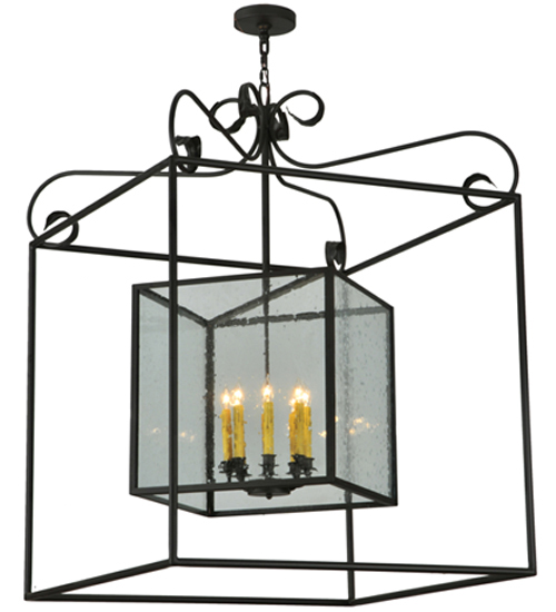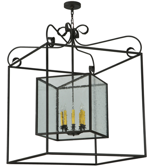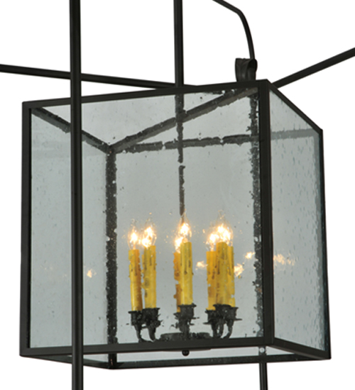 A sophisticated architecturally styled fixture is designed with a pizazz that is unique, fresh and stylish. Give your decor an extra edge with this breathtaking fixture, which is highlighted with a solid steel structure that surrounds a Clear Seeded glass lens encasing Amber faux candlelights perched on an 8-light cluster. The hardware and frame are featured in a handsome Oil Rubbed Bronze finish. Handcrafted in the USA, Kitzi is available in custom sizes, styles and finishes, as well as dimmable energy efficient lamping options. The fixture is UL and CUL listed for damp and dry locations.
