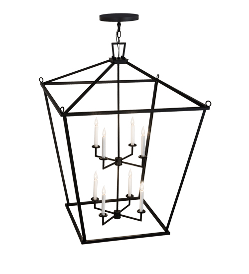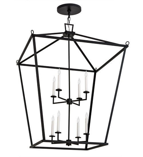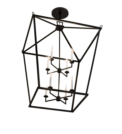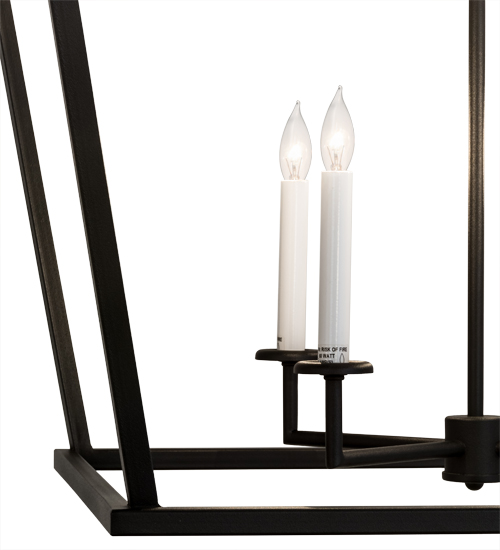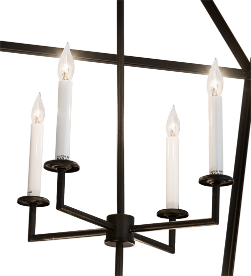 A sophisticated architecturally styled fixture is designed with a pizazz that is unique, fresh and stylish. Give your decor an extra edge with this breathtaking fixture, which is highlighted with a solid steel structure that surrounds two stylized candelabras with White faux candlelights perched on four-light clusters. The hardware and frame are featured in a handsome Blackwash finish. Handcrafted in the USA, Kitzi is available in custom sizes, styles and finishes, as well as dimmable energy efficient lamping options such as LED. The fixture is UL and CUL listed for damp and dry locations.