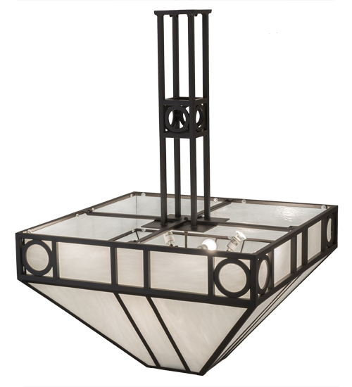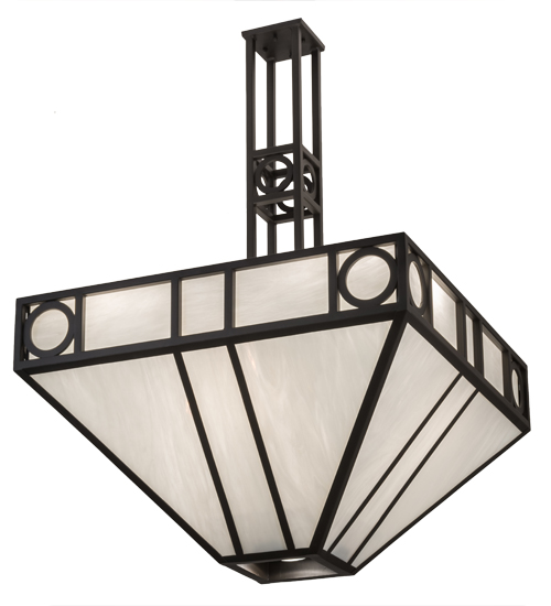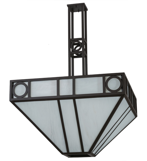 A stunning Transitional look combines both Modern and Mission styling. This Grand Pendant features an inverted White art glass shade highlighted with geometric decorative accents and hardware, which are featured in an Oil Rubbed Bronze finish. Handcrafted in the USA, this Grand Pendant is ideal for illuminating a foyer, conference table, lobby or other large residential and commercial spaces. The fixture is available in custom sizes, styles and colors, as well as dimmable energy efficient lamping options. It is UL and cUL listed for damp and dry locations.