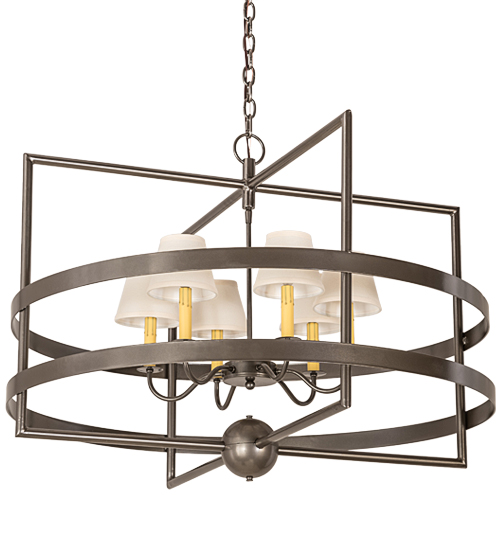 Combining a Grand classic look with industrial styling. The Aldari chandelier features 6 Amber faux candlelights crowned with Cream Linen Shades which provide beautiful ambient lighting from within. A sturdy geometric frame is encircled by two rugged decorative rings for a unique look. The hardware is featured in a Bronze Metallic finish. Ideal for illuminating foyers, living spaces and a variety of other large rooms in residential and commercial settings. Custom crafted by highly skilled artisans in our 180,000 square foot manufacturing facility in Yorkville, New York. UL and cUL listed for dry and damp locations however we do not recommend installing it in spaces that experience a large amount of moisture due to the fabric shades.