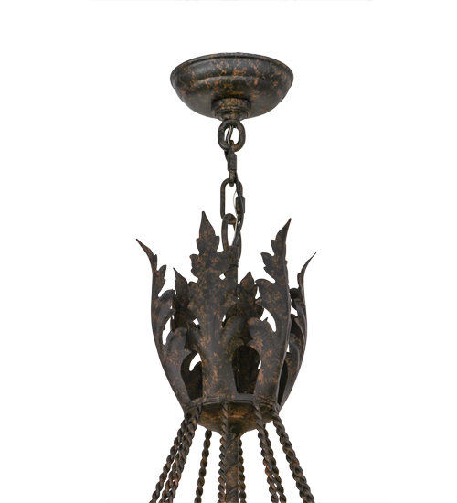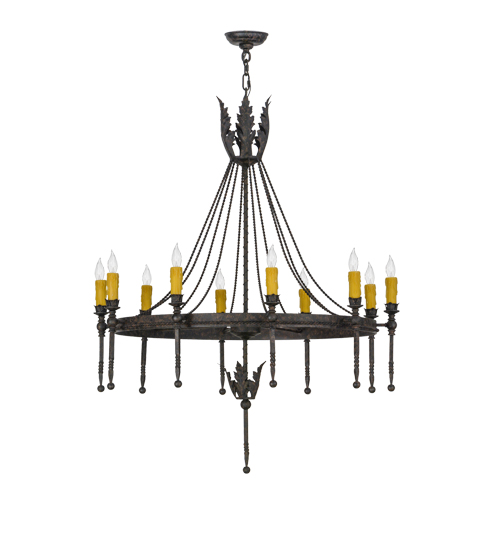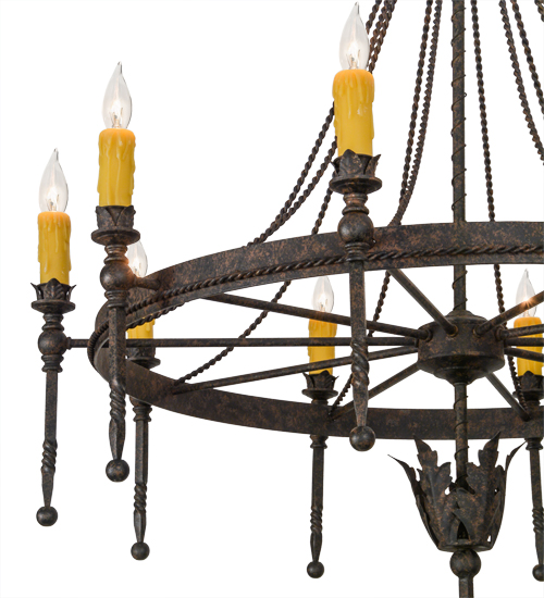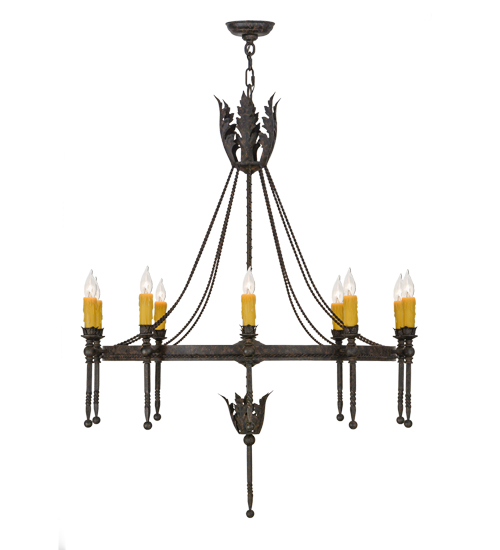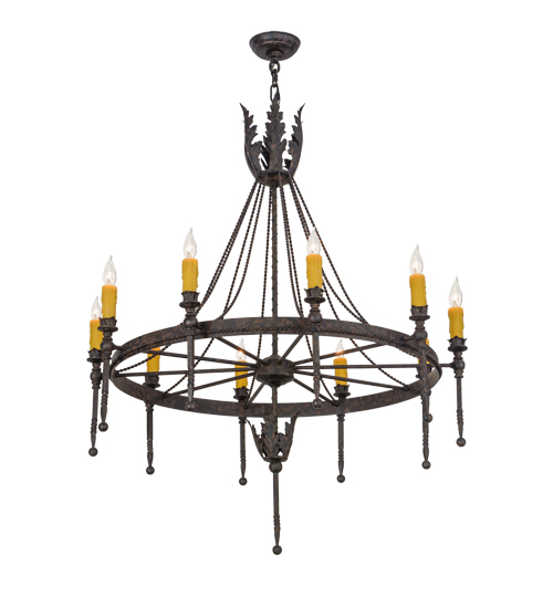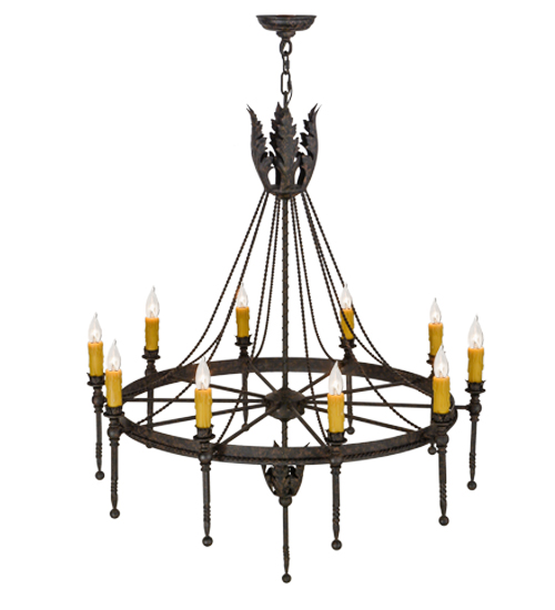 Amaury offers a distinctive look that is rich in styling and artisanship. An Ancanthus leaf crown and finial highlight the decorative spoked ring which is accented with a decorative rope trim. The Coffee Bean finished frame embraces 10 Honey Amber faux candlelights perched on bobeches with extended ballpoint stems. The overall height ranges from 49 to 96 inches as the chain length can be easily adjusted in the field to accommodate your specific lighting application needs. This chandelier and other fixtures are offered in custom sizes, styles and finishes. Handcrafted in our 180,000 square foot manufacturing facility in Yorkville, New York. UL and cUL listed for damp and dry locations.