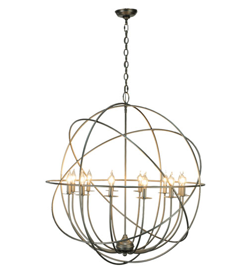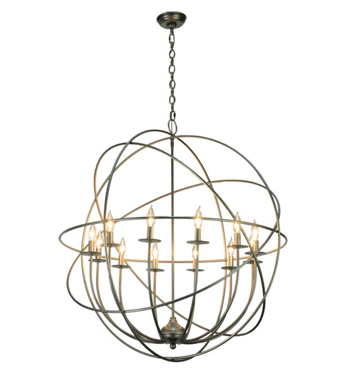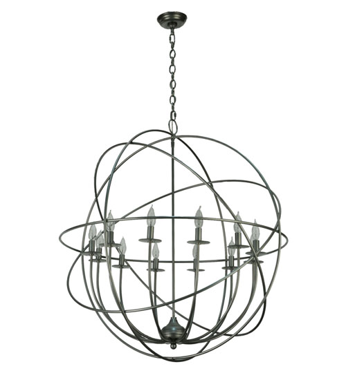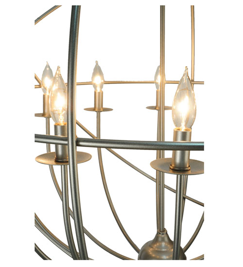 Like a complex gyroscopic structure, Pewter finished metal rings create a unique curvature pattern that evokes the illusion of revolutionary motion like a spinning gimbal rotating on its axis. The orbed frame envelops a smaller frame similar to one that represents atomic energy, which wraps around 12 complementary covered faux candlelights perched on matching bobeches. Custom crafted in our 180,000 square foot manufacturing facility in the USA, this fixture is available in custom colors, designs, and sizes, as well as dimmable energy efficient lamping options. The 36-inch wide fixture is UL and cUL listed for damp and dry locations.