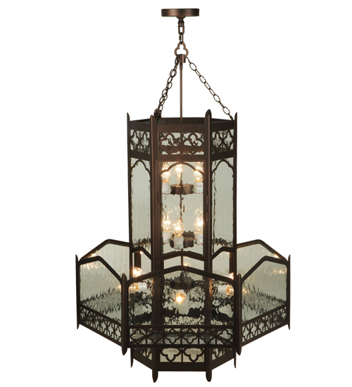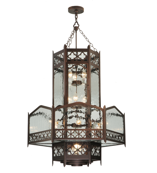 Offering a dramatic inspirational profile and elaborate design. The Church pendant evokes a heavenly glow from Clear Water Glass featured in a hexagonal cylindrical-styled frame that intersects a crown-shaped hexagonal shade. The fixture is accented with a Saltire patterned border offered in a Mahogany Bronze finish that matches the look of the handsome hardware. Custom crafted by highly skilled artisans in our 180,000 square foot manufacturing facility in Yorkville, New York. Special sizes, finishes and diffuser colors available. UL and cUL listed for dry and damp locations.
