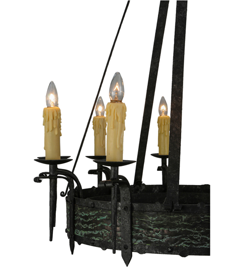 A Hand hammered metal banded belt embellishes the Smoke finished ring of this breathtaking chandelier. 10 Ivory faux candlelights embraced by delicate bobeches are attached to gracefully curved arms and provide beautiful ambient lighting. Make an impressive design statement in lobbies, conference rooms, entryways and other spaces. Overall height ranges from 39 to 74 inches as the chain length can be easily adjusted in the field to accommodate your specific lighting application needs. Handcrafted in our 180,000 square foot manufacturing facility in Yorkville, NY. Candlelight colors, metal finishes and chandelier sizes can be customized to meet your needs. UL and cUL listed for damp and dry locations.
