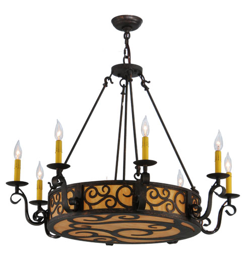 A touch of warm opulence is blended with elegant styling. This chandelier offers a lovely transitional style, which is handcrafted with decorative accents and hand-forged Iron hardware featured in a stunning Cajun Spice finish. The fixture integrates an Ambra Siena Idalight diffuser, which is enhanced with sparkling illumination emanating from eight faux candlelights perched on bobeches embraced by scroll styled arms. Custom crafted in the USA, this fixture is available in custom sizes, styles, colors and dimmable energy efficient lamping such as LED. Delano is UL and cUL listed for damp and dry locations.