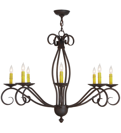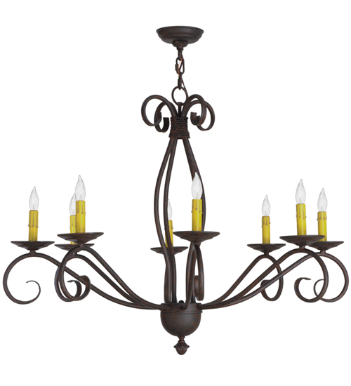 Designed as an elegant statement centerpiece for any room, this Sienna chandelier features 8 Amber faux candlelights that are perched on bobeches with scrolled accents. This lovely custom fixture features a decorative hub and luxurious hardware in a Cajun Spice finish. Quality materials and hand detailed American craftsmanship are perfected by years of time honored artistry, passed down from generations of highly skilled artisans in the USA. This lighting fixture is available in custom sizes, styles, colors and dimmable energy efficient lamping options. Sienna is UL and cUL listed for dry and damp locations.