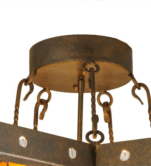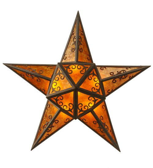 A magnificent five-point Star is brilliantly displayed as an illuminated centerpiece for any room in a residential, hospitality or commercial environment. Designed with five points and complemented with a lighted pentagon shaped hub perched on the bottom, the fixture features exquisite scrolled designs in a Gilded Tobacco finish over a stunning Amber Mica diffusers. The intricate trim features sparkling Clear Glass jeweled accents. Handcrafted by highly skilled artisans in Upstate New York, this fixture is available in custom sizes, designs and colors, as well as dimmable energy efficient lamping options such as LED. The fixture is UL and cUL listed for dry and damp locations.