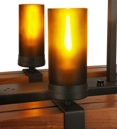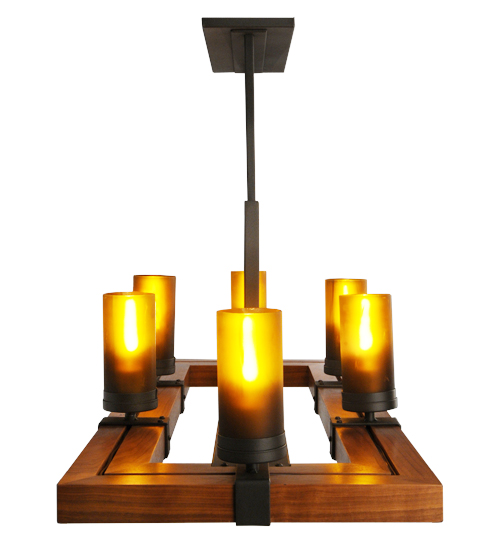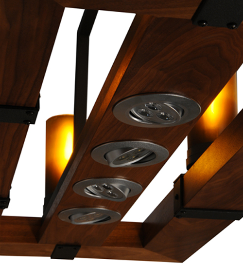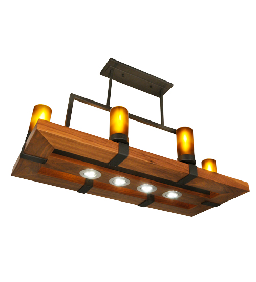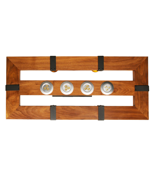 Sophisticated Amber Wine Bottle cylinders provide inviting ambient decorative lighting while four energy-saving, adjustable Nickel-finished LED downlights deliver warm task lighting precisely where needed on countertops, tabletops and other surfaces in kitchens, restaurants and lounges. Handcrafted of fine Walnut wood, the pendant is designed with a bi-level architectural suspension structure and hardware finished in Wrought Iron. The fixture is designed and manufactured in the facilities in Yorkville, New York. Custom sizes, styles and colors are available.