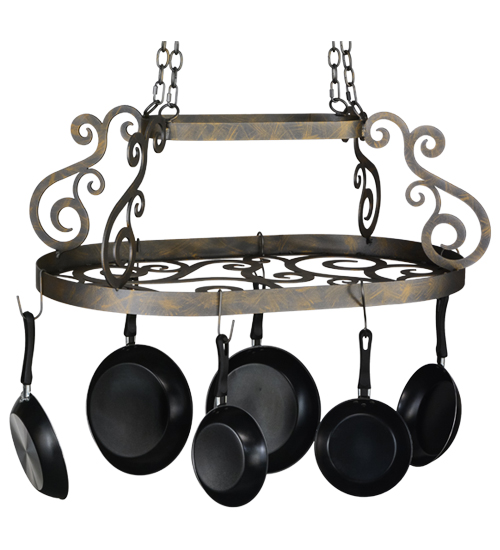A transitional functional design that combines form with function, this pot rack showcases scroll accents and hardware in a French Bronze finish. The frame is designed with hooks to display fine cookware for easy access in today’s kitchens. Handcrafted in the USA by expert artisans, this fixture is available in custom sizes, styles, colors and with a broad range of lamping options if illumination is desired. This 38-inch fixture also can be personalized with your brand name or logo, or family name. (Cookware not included)