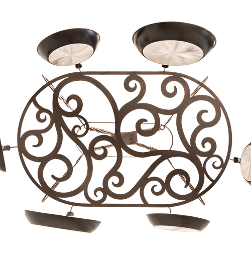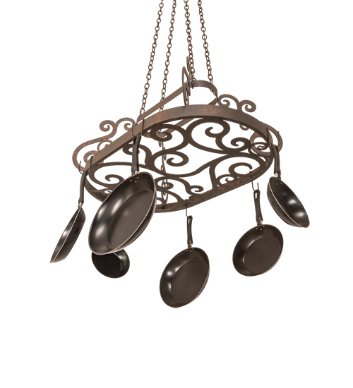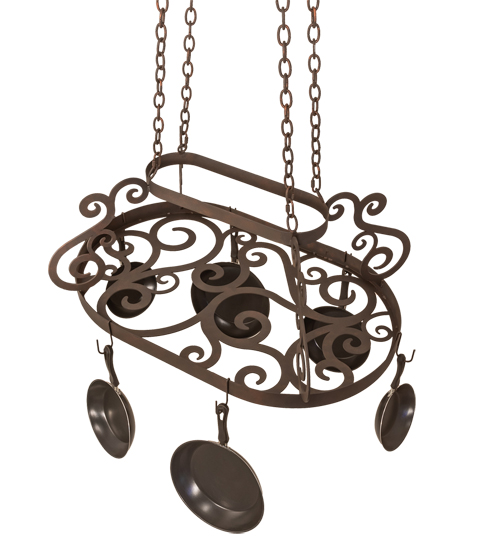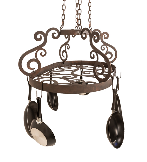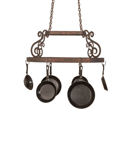 A transitional functional design, this elegant pot rack showcases Hand-forged style Scroll accents and hardware in a Copper Rust finish. The frame is designed with hooks to display fine cookware and accessories for easy access in fine kitchens. The overall height of this fixture ranges from 25 to 58 inches, as the chain length can be easily adjusted in the field to accommodate your needs. Ideal for homes and restaurants from Memphis, Tennessee, to Detroit, Michigan, to Honolulu, Hawaii. The Neo Pot Rack is featured in our American-made, American-designed, handcrafted Pot Rack Collection and manufactured in Yorkville, New York. Lamping, such as LEDs, can be added if illumination is desired. Cookware not included.