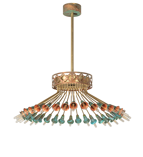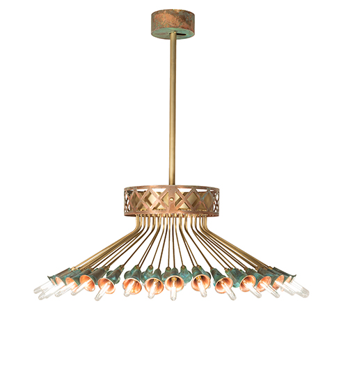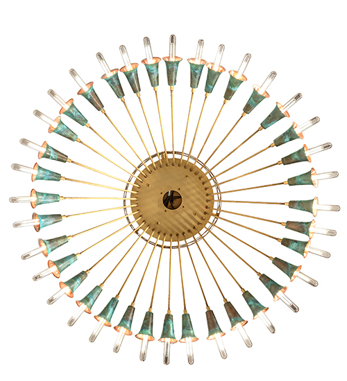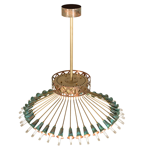 A magnificent masterpiece of Brass, Copper, and energy-efficient LEDs that speaks to drama, excitement, and celebration of beautiful lighting and design. Spring into action and select this innovative lighting design, which features organically bent Brass Tubing finished in Brushed Brass. Beautiful Verdigris Copper finished socket cups, designed as Trumpet Lily flowers, pair beautifully with 36 customer-supplied lamps. This eye-catching ceiling fixture is ideal for illuminating entryways, lobbies, and ballrooms in hotels and other commercial lighting installations. The decorative hub and banding accents are crafted of Copper. The Coyle 36 Light Semi-Flushmount is featured in our American-made, American-designed Coyle Chandelier Collection, which is manufactured in Yorkville, New York. UL and cUL listed for dry and damp locations.