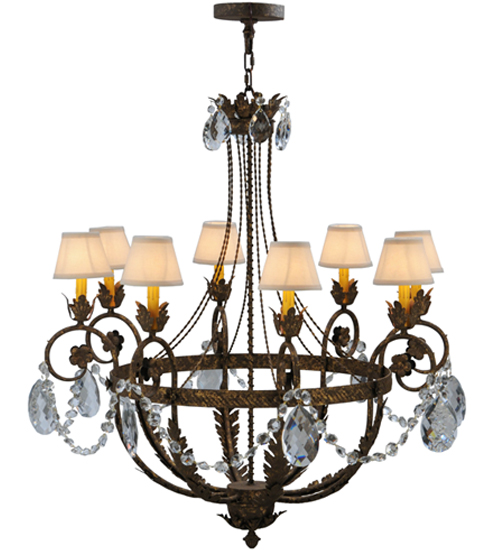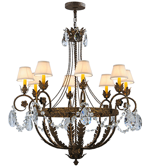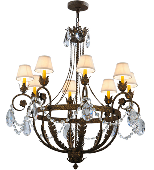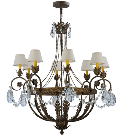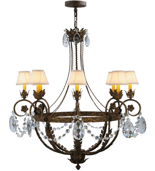 Exquisite styling and luxurious charm are reflected in this elegant Antonia Chandelier which embraces 8 Amber faux candlelights which are crowned with Natural Linen shades and enhanced with faceted crystal charms, scroll arms, Acanthus leaf accents and rich Pompeii Gold finished hand-forged Iron hardware. This chandelier features quality materials and hand detailed American craftsmanship perfected by years of time honored artistry, passed down from generations of highly skilled artisans. Custom sizes, styles, colors and dimmable energy efficient lamping options such as LED are available. The fixture is UL and cUL listed for damp and dry locations.