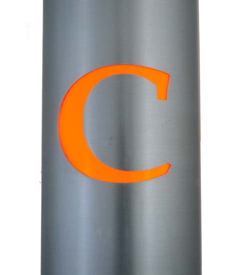 This modern, industrial-styled wall sconce is personalized with the C monogram featured in Orange on a Brushed Aluminum metal structure. The sleek, cylindrical fixture is perfect for installation on walls and facades throughout interiors and covered exterior spaces. The ADA-compliant Personalized “C” wall sconce is included in our American-made, American-designed, handcrafted Personalized collection and is manufactured in Yorkville, New York. The fixture is UL and cUL listed for dry and damp locations. You can order this lighting fixture by calling us and adding your business logo or monogram for your next project. Please call for pricing and lead time. The fixture is featured in the Marriott Courtyard Hotel in New Orleans.