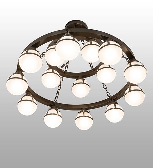 Bola Tavern creates dramatic visual interest with sophistication, romance, and elegance. This exquisite chandelier features two sturdy rings with 15 Contrail Mist Idalight orb diffusers featuring Deco accents on the top and complemented with a Castle Bronze finished frame. The fixture is ideal for installation in fine home and hospitality interiors and exteriors from Boston, Massachusetts, to Palo Alto, California. The Bola Tavern Chandelier is featured in our American-made, American-designed, handcrafted Art Deco Lighting Collection. UL and cUL listed for dry and damp locations and designed by Karen Hanlon.
