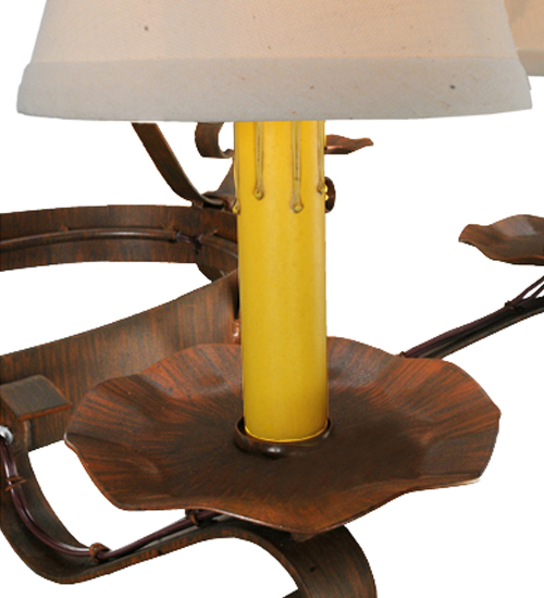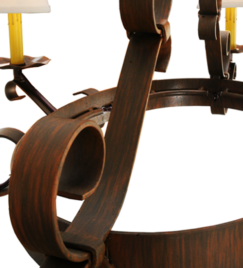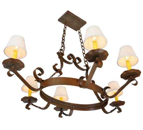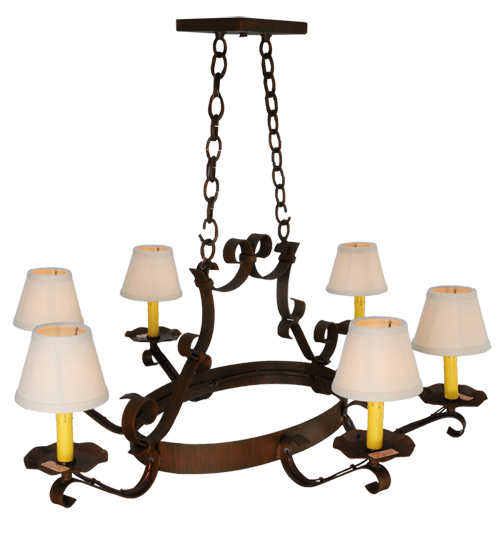 The ultimate in lighting elegance and distinction. Exquisite contours and a timeless eclectic design underscore this stylish oval chandelier. Six Ivory faux candlelights are crowned with Beige Textrene shades and perched on bobeches with Hand-Forged scrolled accents that are featured in Rustic Iron. The chandelier can illuminate counters and tables. The overall height ranges from 29 to 32 inches as the chain length can be easily adjusted in the field to accommodate your specific lighting needs. Handcrafted in our 180,000 square foot manufacturing facility in Yorkville, New York. Diffuser colors, metal finishes and fixture sizes can be customized to your needs. UL and cUL listed for dry and damp locations.