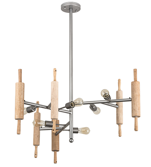 A dramatic combination of rustic lighting and French country style. Rugged Sparkle Silver arms embrace six rolling pins while six Edison-style lamps provide ambient illumination. The Alva Kavel Chandelier is included in our American-made, American-designed, handmade Farmhouse Collection. Manufactured in Yorkville, New York. UL and cUL listed for dry and damp locations.