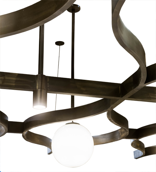 Milky orbs glint with glow among a labyrinth of downlight functionality as this ebulliently bespoke 34′ chandelier emerges from a creative canvas articulating drama & youthful urban sensibility. Rendering a refined organic abstract for a highly polished look & signature eclectic aesthetic, Grand Illumina yields a convergence of art & ingenuity for artists & aesthetes. This clear distillation of a thoughtful sculptural continuum reflects edginess, exuding layered elegance imbued by ethereal funky couture. An arresting modern mix of glass & steel conveys a cross-disciplinary culture of mid-century modern design, employing quintessential panache & pattern-centric punch, capturing architectural spirit with idiosyncratic splendor & grandeur. Featured in the William Vale Hotel in Brooklyn, NY.