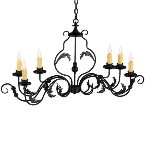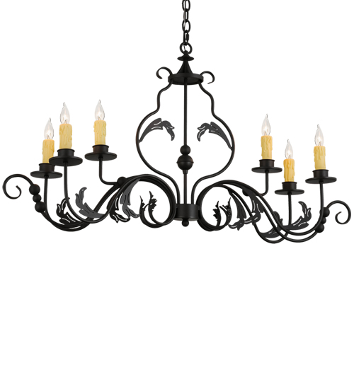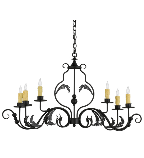 Augusta offers a rich, modern twist on a classic, elegant lighting design. This opulent, sumptuous chandelier features a Wrought Iron finished frame with six Amber faux candlelights perched on bobeches, which are enhanced with Hand-Forged Iron scroll arms and Acanthus leaf decorative accents. The overall height of the fixture ranges from 27 to 62 inches, as the chain length can be easily adjusted in the field to accommodate your specific lighting application needs.�This Oblong fixture is ideal for illuminating islands, dining tables, bars, and counters in residential and commercial settings from Lexington, Kentucky, to Lake Tahoe, Nevada. The Augusta Oblong Chandelier is featured in our American-made, American-designed, handcrafted Traditional Lighting Collection, which is manufactured in Yorkville, NY. UL and cUL listed for dry and damp locations.