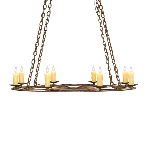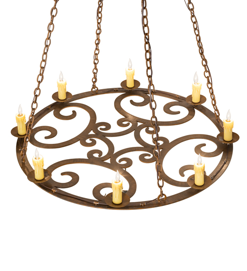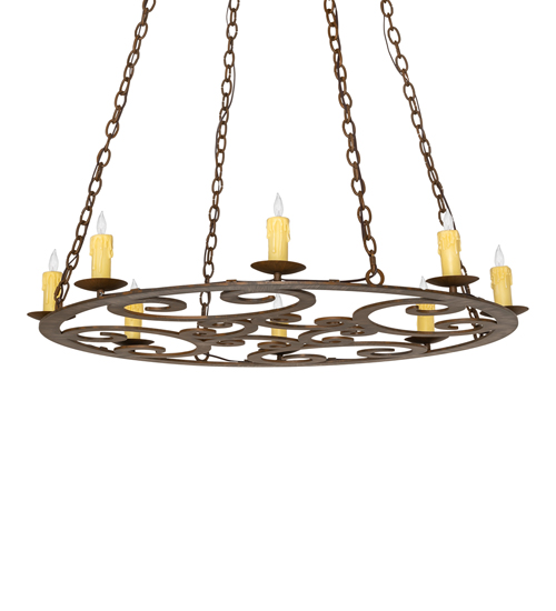 Gracefully and elegantly designed as a centerpiece for nearly any space, the distinctive Ashley chandelier features an exquisite decorative ring with fanciful scroll designs. Perched on bobeches above the ring are 8 delicate Ivory faux candlelights which provide beautiful ambient illumination. The decorative accents, frame and hardware are featured in a Rustic Iron finish. Made in the USA, this chandelier is available in custom designs, colors, sizes and dimmable energy efficient lamping. The 42-inch wide fixture is UL and cUL listed for damp and dry locations.