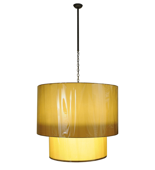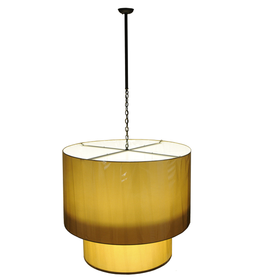 Add drama to a foyer, lobby or other large spaces with this two tiered, architecturally styled fabric sha de with this two tiered, architecturally styled fabric shade offered in a warm Toast (Brown/Beige) color with a matching fabric diffuser on bottom. Energy efficient, the pendant uses 8 32wt 4-pin CFLs. An Oil Rubbed Bronze finished chain, downrod and canopy included. The fixture is handcrafted by artisans in Upstate New York. Custom sizes, styles and colors available. Additional lamping options available.
