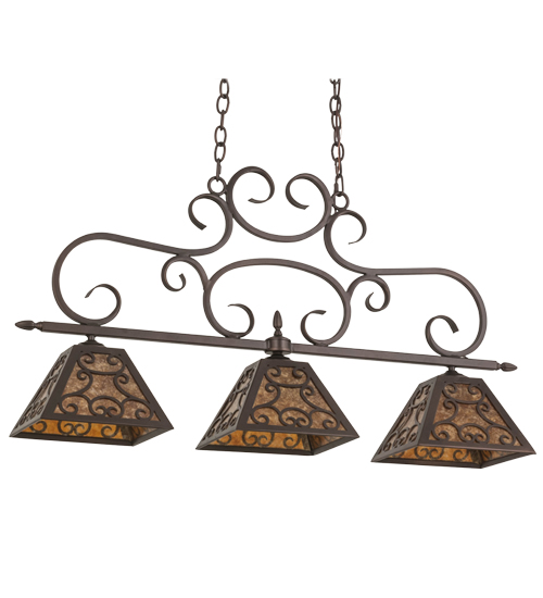 An exquisite oblong pendant features three stunning Amber Mica shades which are accentuated with elegant, fanciful scroll designs and crowned with matching scroll styled metalwork. The frame, decorative accents and hardware are featured in a Mahogany Bronze finish. This oblong pendant is ideal for illuminating dining tables, billiard rooms, reception areas, islands, counters and other fine interiors. Custom crafted at our manufacturing facility in the USA, Bandolei is available in custom sizes, styles and colors, as well as dimmable energy efficient lamping options such as LED. The fixture is UL and cUL listed for damp and dry locations.