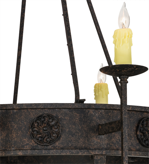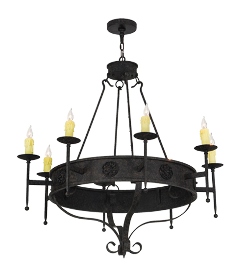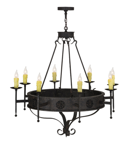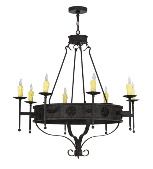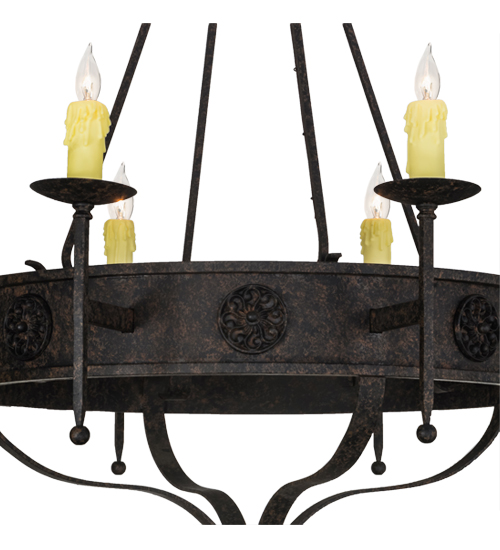Integrating a rich charm and artistic look, the Lorenzo steel chandelier features floral medallions and is adorned with 8 exquisite Ivory faux candlelights perched on bobeches with long ballpoint arms. The fixture is enhanced with hand forged hardware and a scrolled finial featured in a warm Coffee Bean finish. The fixture is ideal for entryways, dining areas, lobbies and other rooms in a variety of residential and commercial settings. The chandelier is handcrafted by highly skilled artisans in the USA. Options include dimmable energy efficient lamping, as well as custom sizes, styles and colors. The fixture is UL and cUL listed for damp and dry locations.
