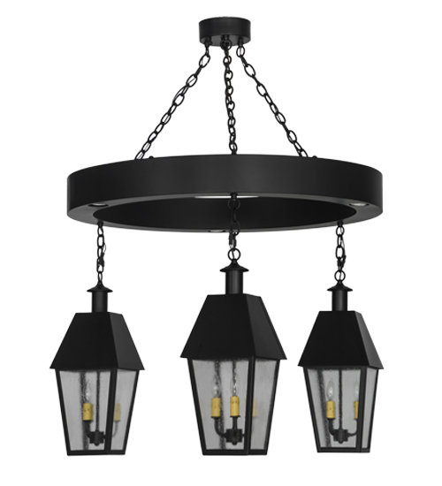 Add archaic beauty with a decorative touch to your castle. An architecturally styled ring designed with three downlights embraces old world lanterns, each with three light candelabras behind Rainstone Idalight. The hardware is finished in a Flat Black. Custom crafted by artisans in Upstate New York for superior quality and reliability. Custom sizes, styles, finishes and dimmable lamping are available. The fixture is UL and cUL listed.